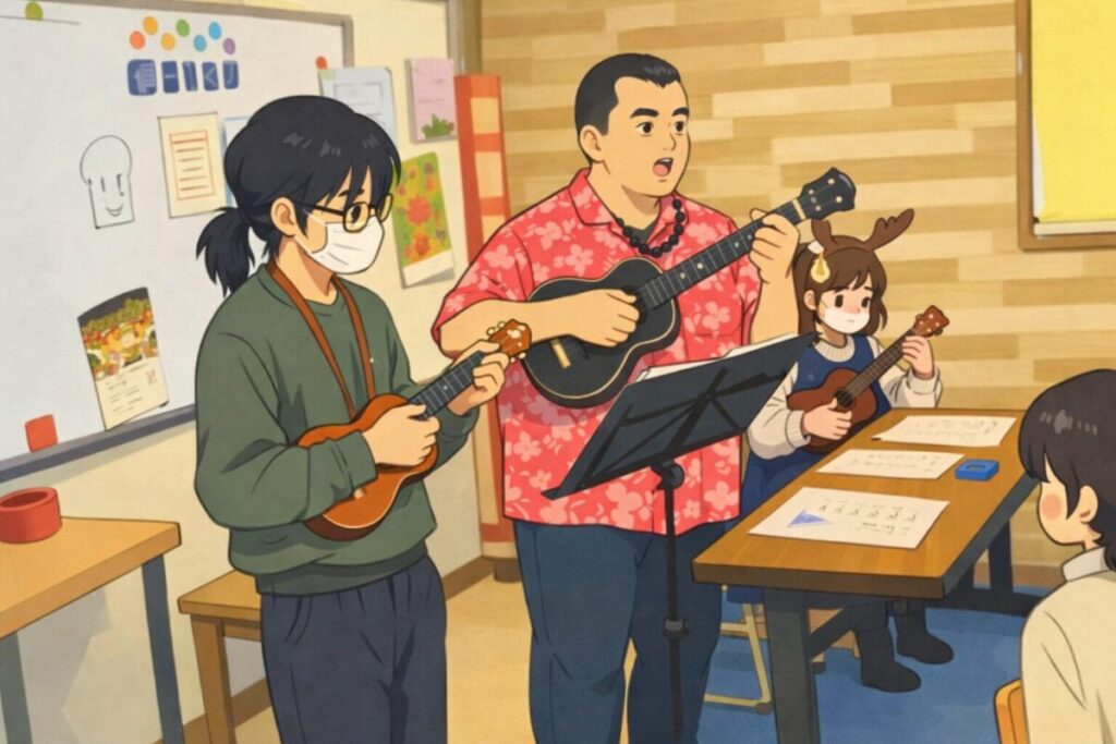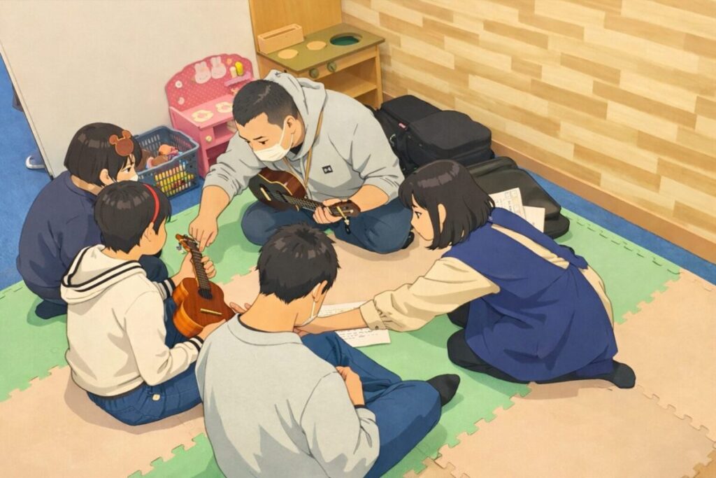 児童の一人はウクレレに触れ、ぜひやってみたいとのことで可能性が広がったと思います。