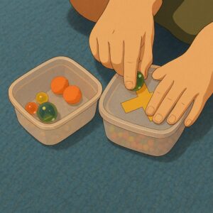 先日、輝HIKARIみらいでは、おともだちみんなでプットインレースをしました。 左側の容器に入ったビー玉などを右側の容器に指で押して入れることを競います! イラストには描かれてませんが、実際黄色のばってんのところには切り […]
